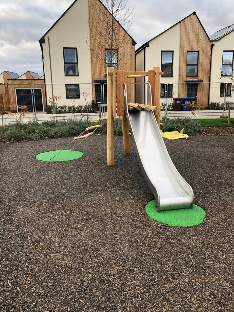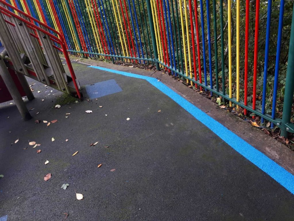 If you decide to remove the play equipment from the area, but still want it to be a place for children to play, with a funky pattern or design, a wet pour repair is definitely still an option. At The Meadows School, they had some old wooden equipment that had been removed. However, they left the stumps in the wet pour play area, creating a trip hazard. For this kind of request, you would cut out a shape around stumps and replace that part of wet pour with a new colour. At The Meadows, we created blue wet pour shapes in place of where the equipment used to be.