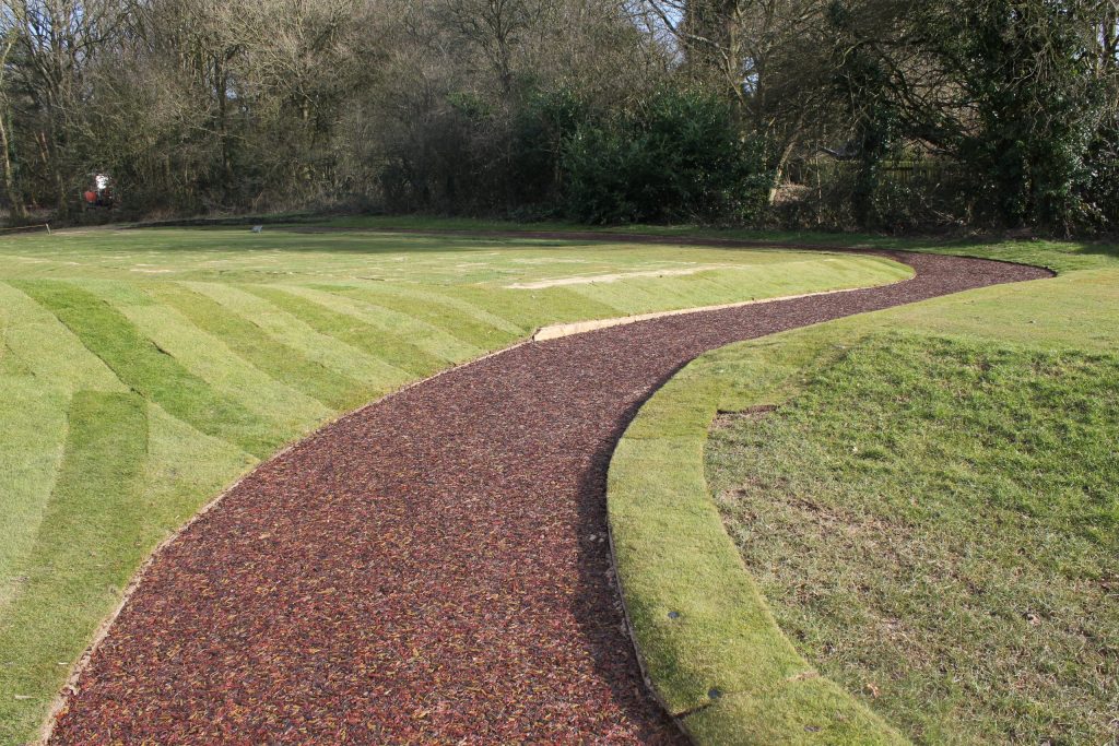 Artificial grass, popular on golf courses, creates a flat, low-maintenance surface. Meanwhile, a JungleMulch pathway is delineated by its vibrant colour through the green field. Also we can install distinct edging using the natural landscape to the course’s advantage. The seams between the two materials can also be made more accessible for wheelchairs and golf buggies alike with rubber edging ramp strips.