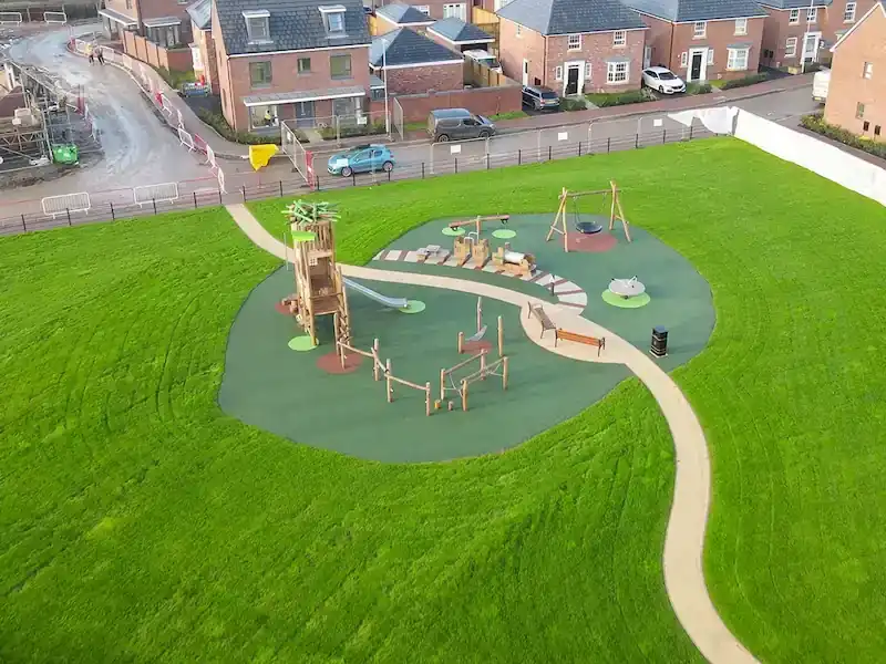Using Rubbasmart wetpour granules we followed this bespoke design, the installation was completed ensuring the colours stand the test of time providing all the children on this site with an imaginative and safe Play Area set in a Housing Development.